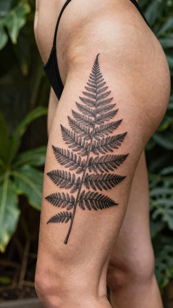 Feel free to adjust the size for varying effects. A small fern serves as a gentle accent, while a larger design can become a striking focal point. Adding shading or fine lines enhances the fern’s texture, bringing your tattoo to life.