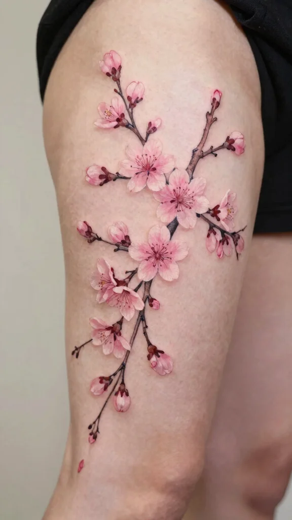 Placement on the thigh allows the design to follow your leg’s natural curves. Whether you prefer a minimalist black outline or soft pink hues, cherry blossoms symbolize hope and new beginnings, enhancing your overall aesthetic.