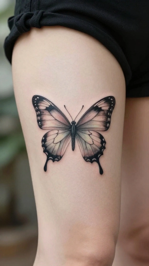 Dainty butterfly tattoos are whimsical and meaningful, representing transformation and freedom. They add a feminine touch to your lower thigh while keeping a subtle profile. You can select from various sizes, whether small and delicate or larger with intricate details.