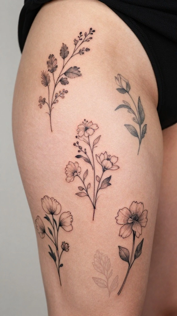 For a subtle look, start with minimalist floral designs that fit the curves of the lower thigh. Tiny blossoms, a delicate stem, or a small vine along the outer side are popular choices for lower thigh art in lower thigh tattoos women. Go with fine lines in black ink for timeless elegance, or add a touch of muted color if your skin tone allows it. Work with an artist who specializes in feminine thigh tattoos and tattoo designs for women to get the right scale and line weight.