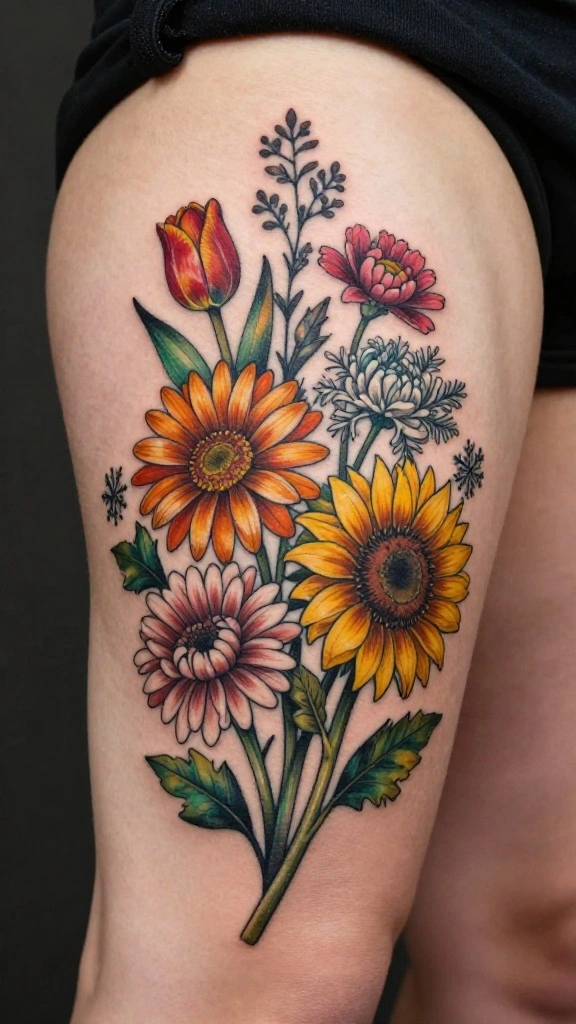 Celebrate the beauty of each season with floral tattoos inspired by your favorite blooms for spring, summer, fall, and winter. This approach allows for versatile designs that change with the seasons, turning your mid thigh tattoo into a dynamic representation of nature.