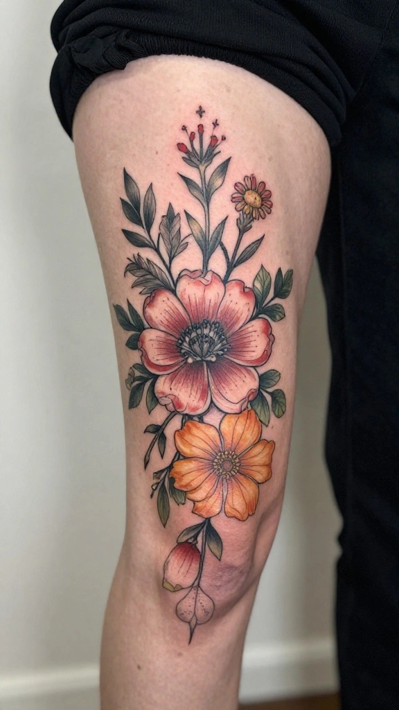 Watercolor tattoos are a popular trend that brings a dreamy quality to any floral design. A mid thigh tattoo featuring watercolor effects can combine vibrant and soft hues, resulting in an impressionistic work of art.