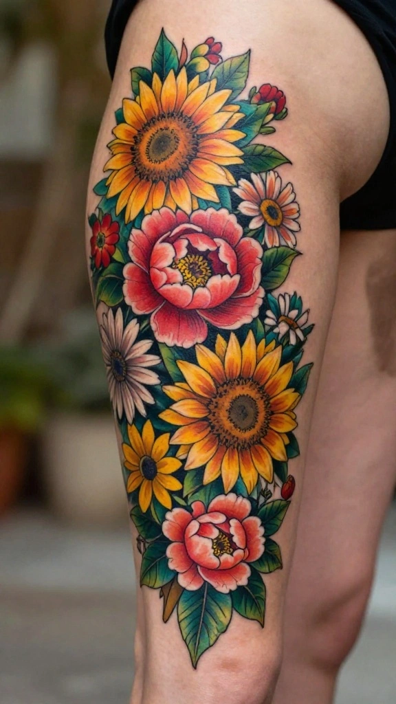 Why not showcase your love for flowers with a vibrant floral sleeve that cascades onto your mid thigh? This striking design can feature a variety of blooms like sunflowers, daisies, and peonies, bursting with color and life. The combination can create a harmonious flow that draws attention and enhances your leg’s silhouette.
