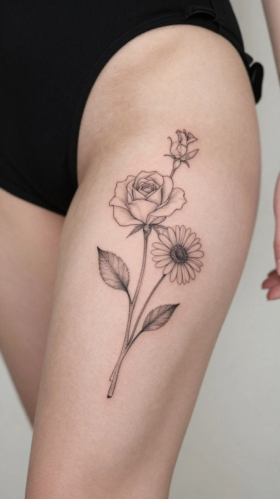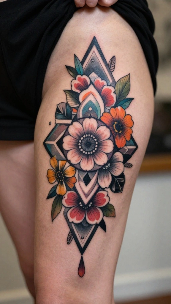 This style adds contrast to the delicate nature of the flowers, enhancing the visual experience on your thigh. Consider mixing vibrant colors for the flowers with monochromatic geometric designs to achieve a balanced and striking look.
