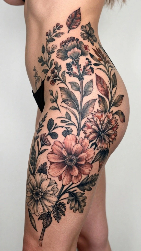 Imagine transforming your mid thigh into a mini botanical garden filled with diverse flowers and plants. This intricate design can incorporate everything from delicate wildflowers to lush ferns, creating a rich tapestry of body art.