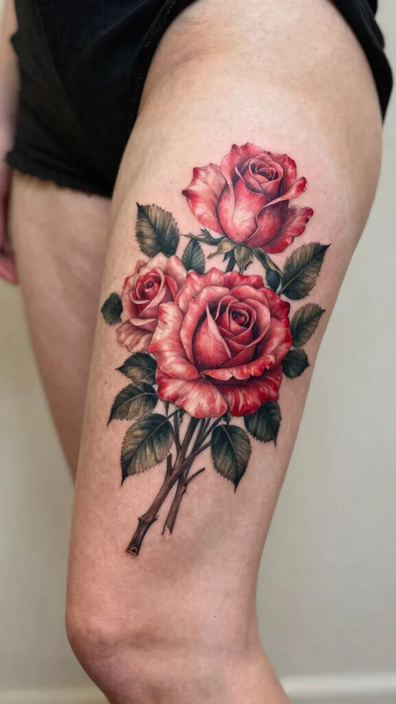 If you’re yearning for a tattoo that exudes elegance and romance, consider an elegant rose bouquet on your outer thigh. This design typically showcases a vibrant collection of blooming roses, intertwined with delicate leaves and thorns, offering a captivating visual that speaks to the heart. The beauty of this tattoo lies in its symbolism—representing love, passion, and beauty—which makes it a timeless choice for many women.