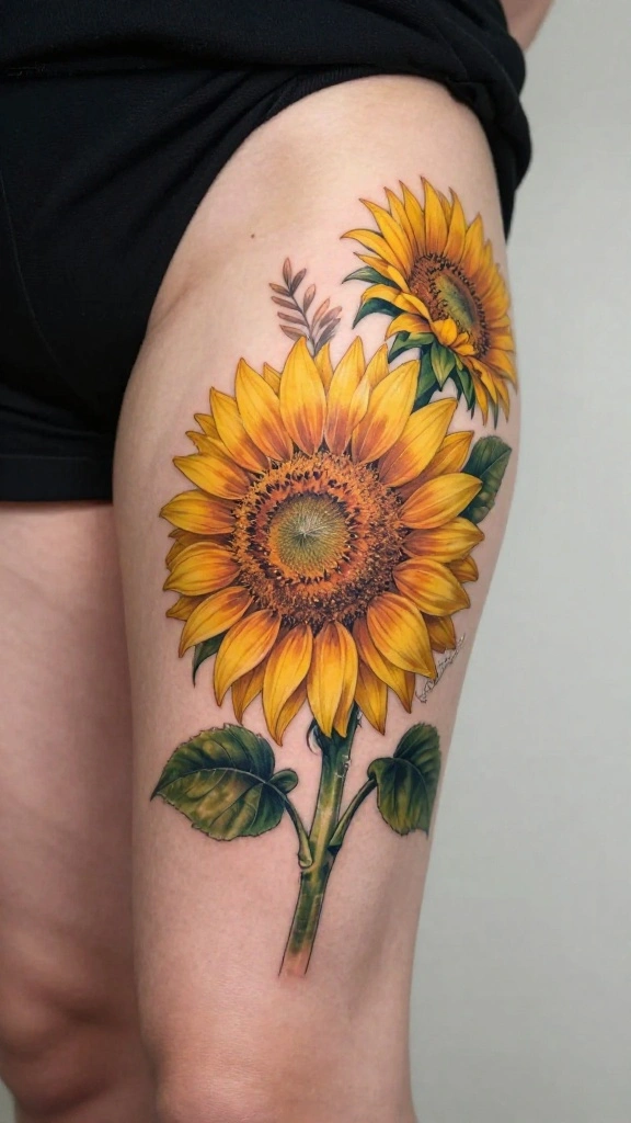 Playing with colors, such as vivid yellows and deep browns, can bring your tattoo to life. You might also consider intertwining greenery or other flowers for added contrast and depth.