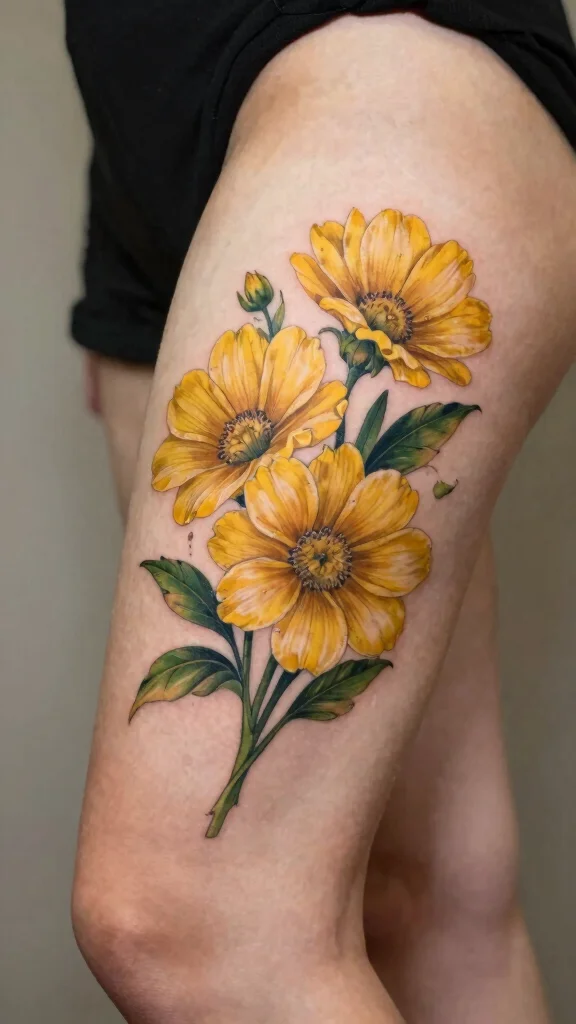 The tattoo can be designed in bright yellows and greens for a fresh, lively look. Adding soft shading can enhance the three-dimensional aspect of the flowers, giving them a vibrant appearance.
