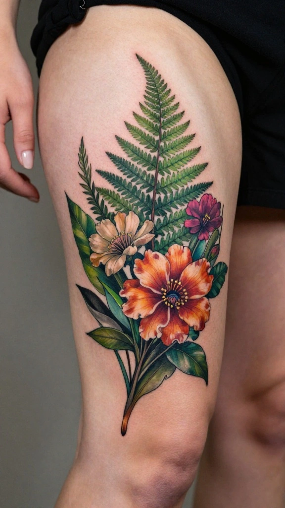 A resilient fern and flower mix tattoo exudes both strength and femininity. Ferns symbolize sincerity and magic, making them a unique addition to any floral design. This tattoo can combine lush ferns with vibrant flowers, creating a rich tapestry of natural beauty on your outer thigh.