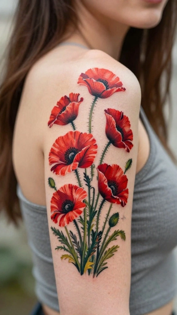 The flow of this design can mimic the wind blowing through the flowers, adding a sense of movement to your tattoo. Consider using different shades of red and touches of black or yellow for the centers of the poppies for added detail.