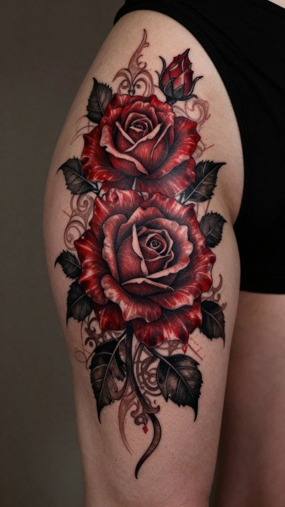 To make your tattoo truly stand out, opt for a realistic style with intricate shading that adds depth. Choose a color palette that resonates with you, whether it’s a passionate red or soft pinks for a more subtle touch. This design can be adapted to match your personal style, whether you prefer a small cluster or a sprawling arrangement.