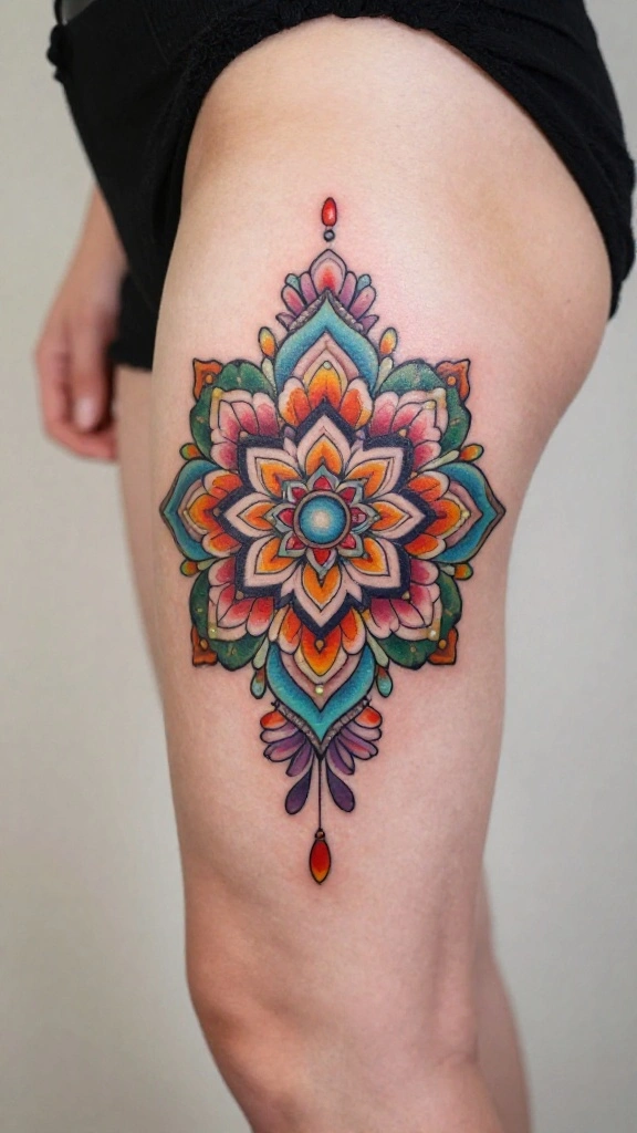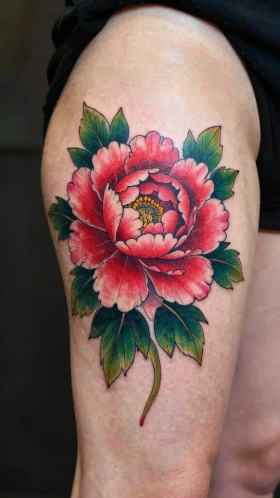 If you want a tattoo that makes a bold statement, a vibrant peony explosion is a fantastic choice. Known for their lush layers of petals, peonies are linked to love, prosperity, and good fortune. This design can cover a larger area on your thigh, filled with a stunning array of colors that are sure to catch the eye.