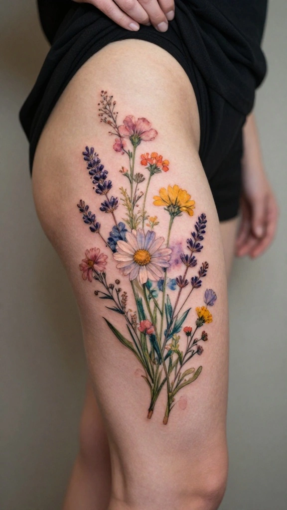 For nature lovers, a dainty wildflower arrangement on the outer thigh captures the essence of untamed beauty. Wildflowers symbolize joy and resilience, making this tattoo a delightful choice. With a gentle mix of blossoms such as daisies, lavender, and buttercups, this design can evoke a sense of freedom and whimsy.