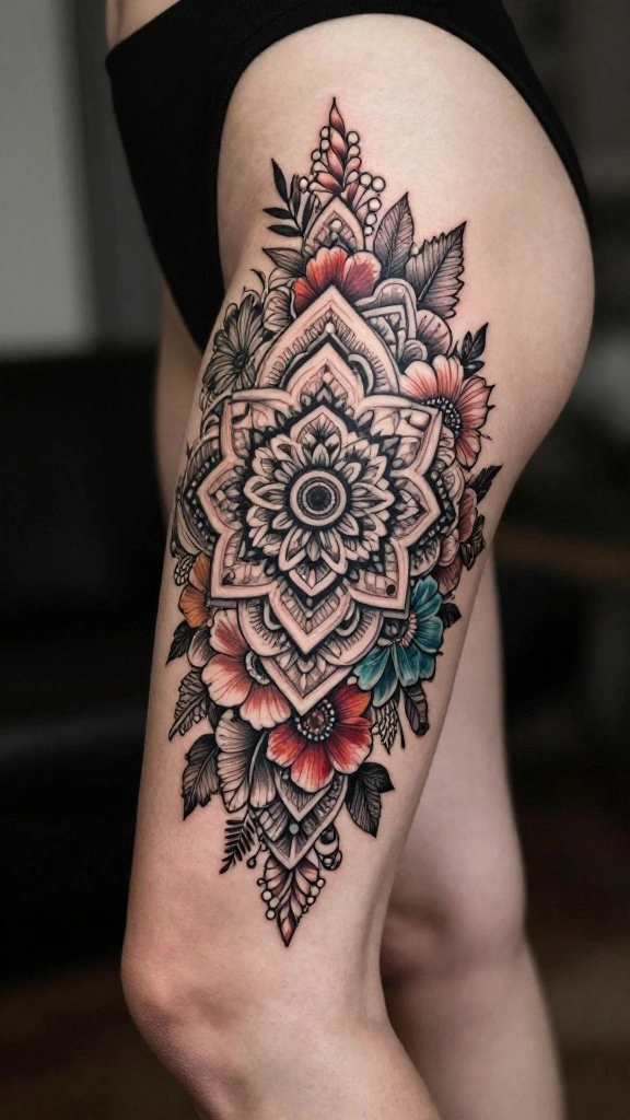 An energetic floral mandala tattoo combines the beauty of flowers with the symmetry of mandalas, resulting in an intricate and captivating design on the outer thigh. This style often represents harmony and balance, making it a popular choice among women who seek deeper meaning in their body art.