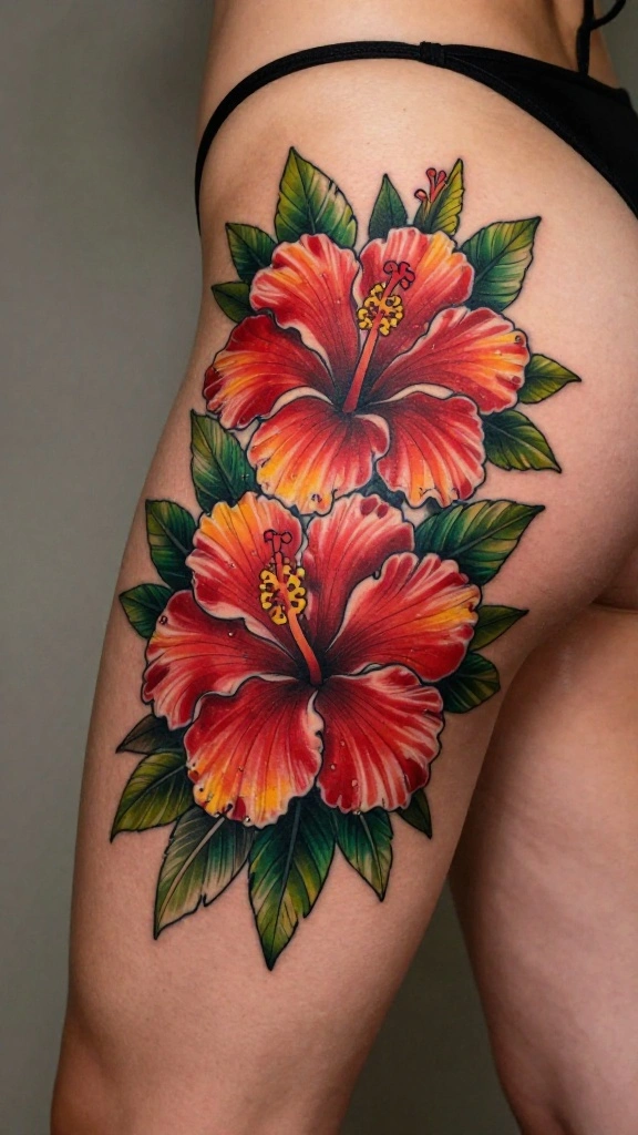 Infuse vibrant energy into your body art with a tropical hibiscus tattoo on your outer thigh. Hibiscus flowers symbolize beauty, charm, and friendship, perfect for those who want their tattoos to convey a light-hearted message. The large blooms can be designed in a variety of colors, such as deep reds or sunny yellows, making them a standout piece.