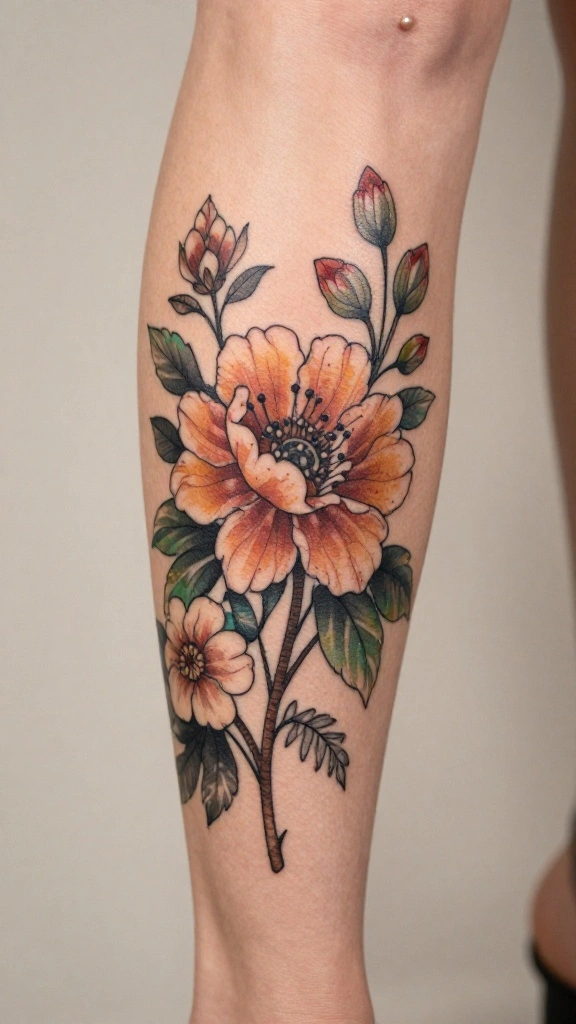 The intricate detailing of peonies creates a captivating effect, especially when paired with complementary blossoms or foliage. Think about a color scheme that incorporates deep reds, bright pinks, or soft oranges to add vibrancy and depth. You can even opt to wrap the peonies around your thigh for a dynamic flow.