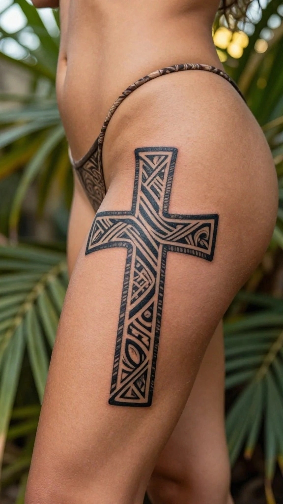 If you’re searching for a tattoo that embodies strength and protection, the Marquesan Cross could be your perfect choice. This stunning design combines bold lines and geometric shapes, creating a striking visual that resonates deeply. Many women appreciate how this tattoo merges femininity with a powerful cultural symbol, making it ideal for thigh placement.