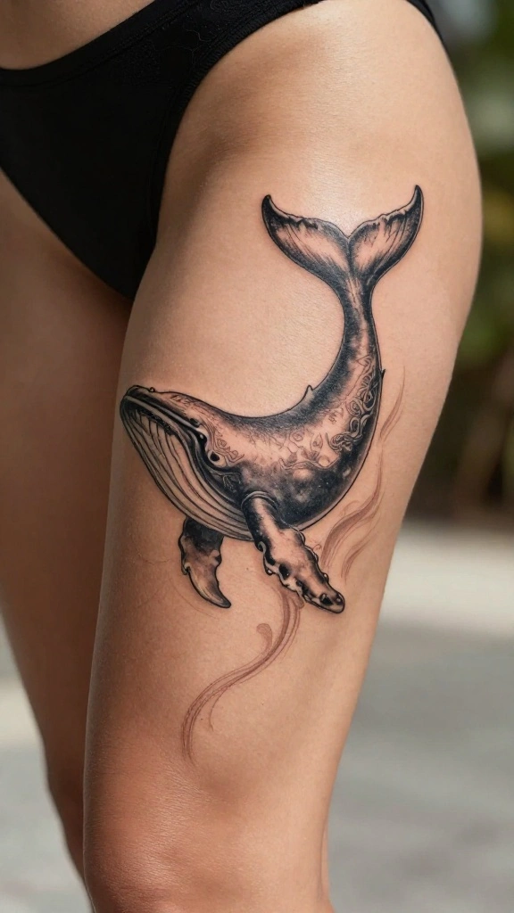 Whales symbolize wisdom and emotional depth in Polynesian culture. A whale tail tattoo on your thigh can powerfully represent strength, freedom, and a connection to the ocean. This design can flow beautifully along your thigh, accentuating its curves.