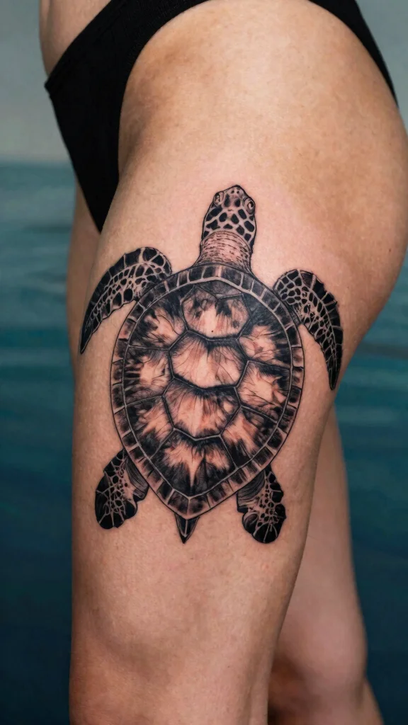 Many women appreciate this tattoo for its deep symbolism and connection to nature, as turtles protect the ocean. The thigh placement allows for a larger, eye-catching design.