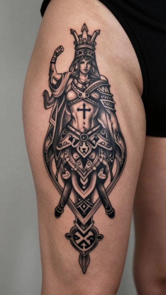 This design often features intricate patterns and symbols that tell personal stories, making it a meaningful tattoo. Many women feel empowered wearing such a significant emblem on their thighs.