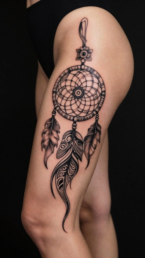 Dreamcatcher tattoos symbolize protection and peace, perfect for women channeling positive energy. This design can incorporate traditional Polynesian patterns, blending cultures beautifully. Placed on the thigh, the dreamcatcher can be intricately designed, adding to its artistic appeal. Women often embrace this tattoo to remind themselves of their dreams and aspirations, creating visual motivation in their lives.