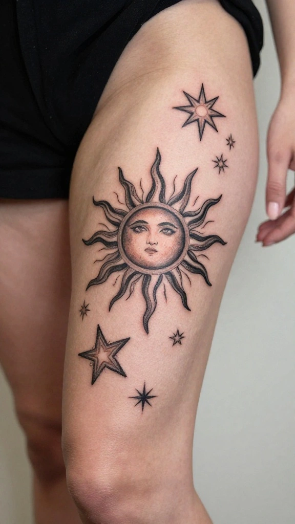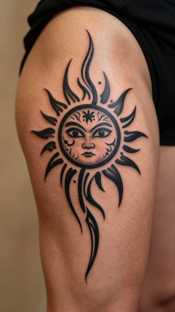 Tribal sun tattoos symbolize life and energy, ideal for women embracing vitality and positivity. This design can be bold and vibrant, making it a stunning focal point on the thigh. Many women choose this tattoo to represent their zest for life, celebrating individuality and inner strength. The tribal aspects can incorporate intricate lines and patterns, adding depth and meaning to the design.