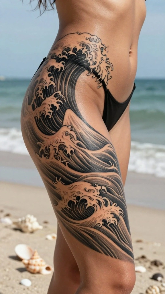 The flowing lines of wave patterns naturally complement the curves of your thigh, enhancing their elegance. You can customize this design to reflect your personal style, whether you prefer thick outlines or intricate details.
