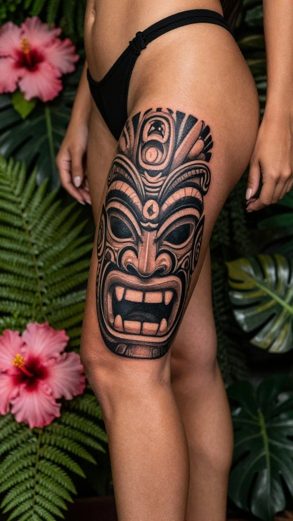 Tiki masks carry profound meaning in Polynesian folklore, often symbolizing protection and good fortune. These tattoos can be strikingly beautiful, featuring fierce expressions and intricate details that tell stories of heritage. Women can showcase their lineage with a unique tiki mask tattoo on their thigh, making it a conversation piece.
