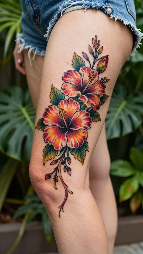 Floral tattoos, especially hibiscus, beautifully symbolize love, beauty, and growth in Polynesian culture. These designs can be soft and feminine, perfect for women wanting something delicate yet meaningful on their thighs. A floral tattoo can be crafted in vibrant colors or classic black, depending on your personal style.
