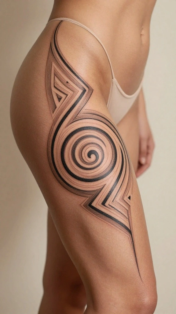 Geometric spirals symbolize growth and transformation, ideal for a tattoo that represents your journey. These designs can elegantly spiral down your thigh, creating a captivating visual effect. Many women choose this tattoo to signify life’s ups and downs, making it a personal narrative.
