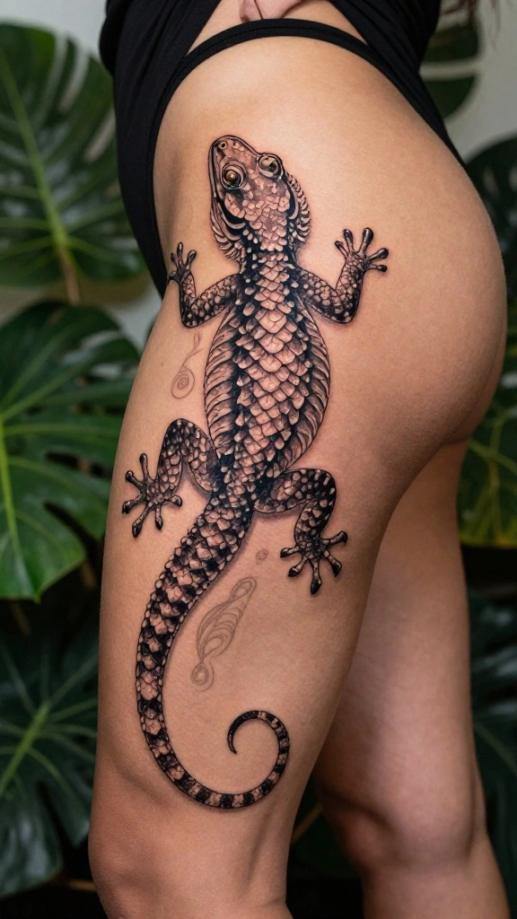 In Polynesian culture, geckos symbolize adaptability and protection, making them a perfect tattoo choice. A gecko tattoo can embody resilience, blending beautifully with your thigh’s natural curves. Many women appreciate this design for its artistic detail, showcasing the gecko’s unique features.
