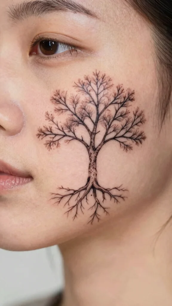 Tree tattoos symbolize growth, strength, and stability. A small tree tattoo inked on the side of your face or behind your ear can represent your roots and life journey. These tattoos can be detailed or simple, allowing for personal expression connected to nature.