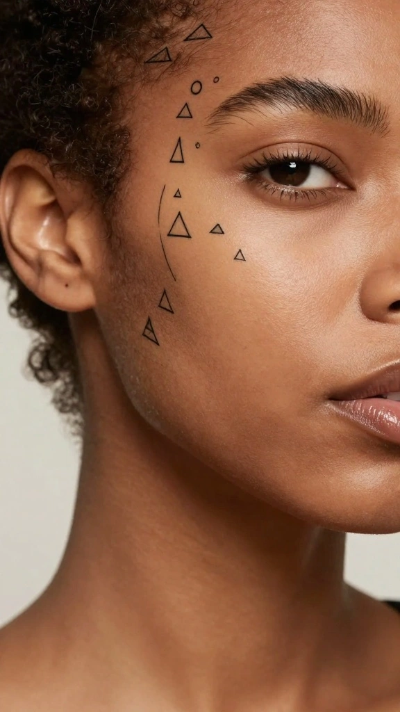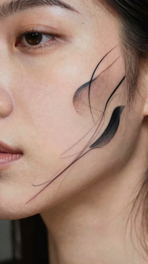 Abstract shapes let small face tattoos for women tell a spontaneous story without shouting. Start with a tiny dash or dot near your temple, then watch your meaning evolve as you wear it—it’s art that’s personal, chic, and endlessly adaptable.