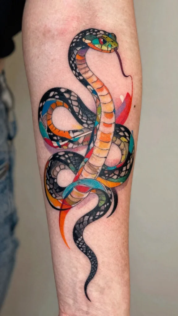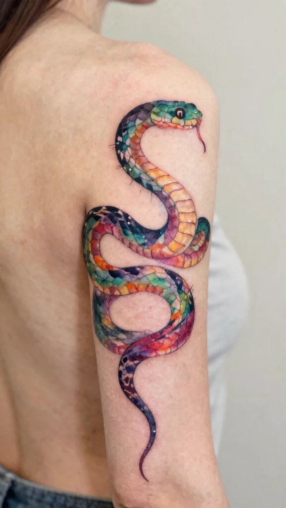 A watercolor snake tattoo is visually striking, infusing artistic flair into your body art. This style features vibrant colors that blend and flow, creating a dreamy aesthetic that captures attention.