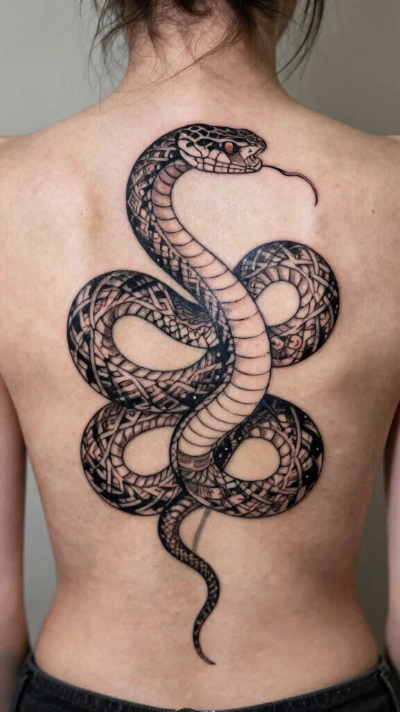 A snake tattoo on the back can be a large, powerful piece that tells a significant story. This design allows for intricate detailing and complex symbolism, covering a substantial area.