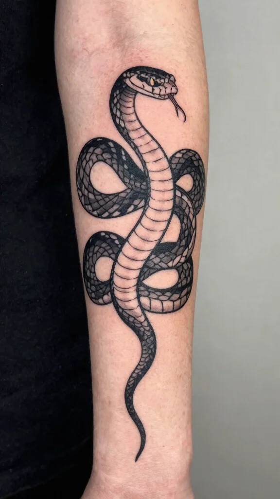 A bold black snake tattoo radiates strength and confidence, often depicted in solid black ink for a dramatic effect. This design is perfect for those wanting a powerful statement piece that stands out.