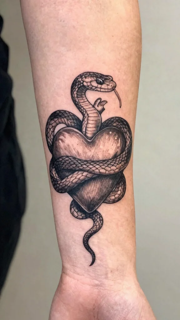 The snake with heart tattoo beautifully illustrates the intertwining of love and strength. This design features a snake gracefully coiling around a heart, embodying the idea that love requires both courage and resilience.