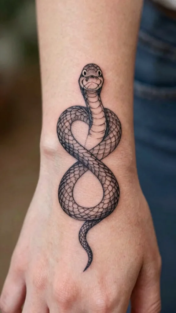 The infinity snake tattoo embodies eternal love and connection, featuring a snake that forms the infinity symbol. This design strikes a balance between boldness and delicacy, making it a great choice for those who value deep emotional ties. It represents life’s endless cycles and the wisdom that comes with them.