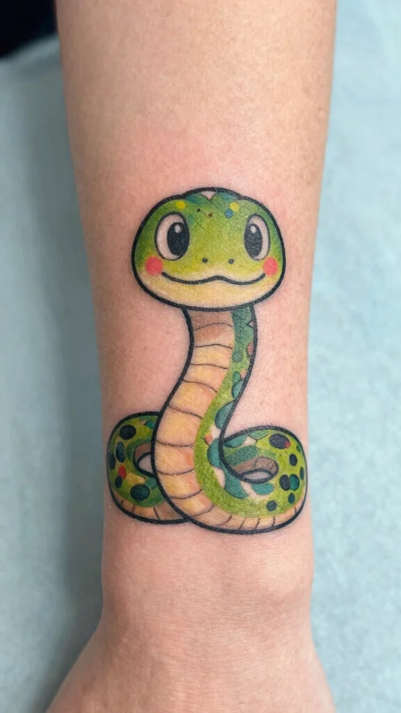 If you’re looking for a playful tattoo, a whimsical cartoon snake design adds a fun twist to your ink. This design features an adorable snake with exaggerated features, perfect for showcasing your personality and sense of humor. It represents a lighter perspective on life while maintaining the snake’s symbolic meaning.