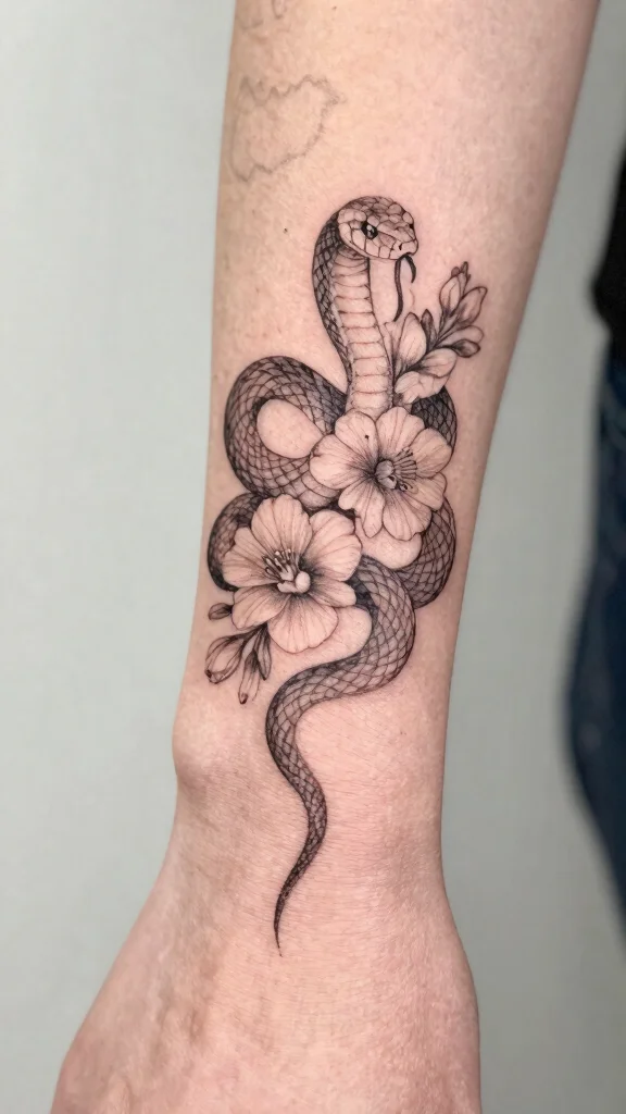 Combining a snake with floral accents brings a lovely blend of strength and femininity to your tattoo. This design features a slender snake intertwined with delicate flowers, creating a stunning contrast that captures the eye. It’s ideal for women who wish to express both their softer side and a fierce spirit.