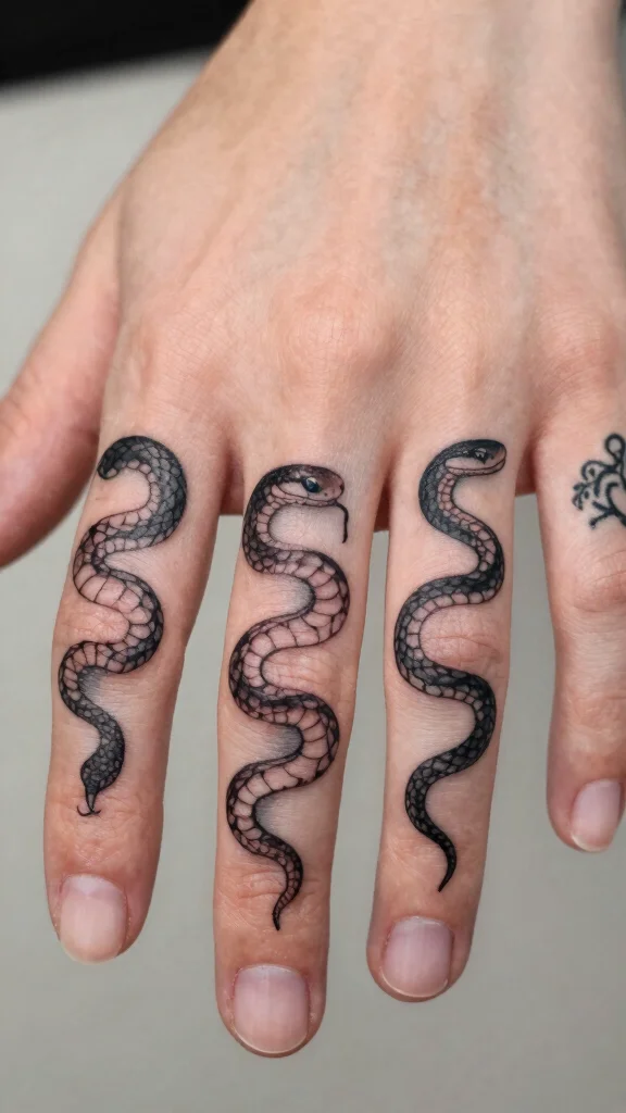Finger tattoos tend to be more painful than larger areas because the skin is thin and close to bone. Expect a sharp, brief sting during the outline and a tender healing period as the ink settles. Aftercare is essential: wash gently, pat dry, apply a fragrance-free moisturizer, and avoid soaking or picking at the skin. Keep the area clean and dry, and protect it from the sun with sunscreen once fully healed. Healing usually takes 2–4 weeks, and you may need a touch-up for fine lines in the future to keep your delicate snake tattoos looking sharp. If you’re aiming for long-lasting color, choose an experienced artist who specializes in minimalist snake tattoos and finger tattoo designs.
