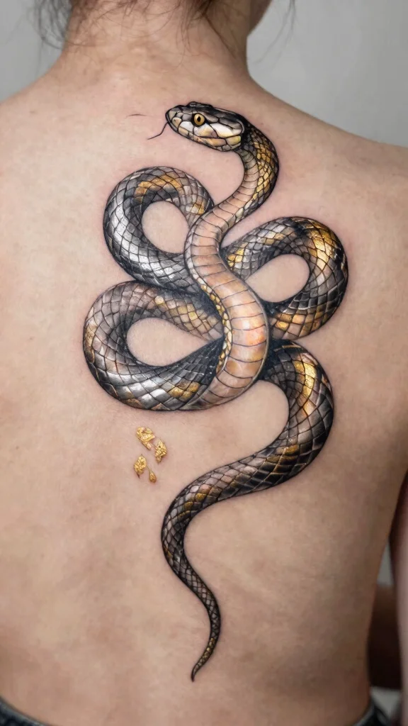 If you want to embrace a modern look, metallic shades like silver, gold, and bronze can elevate your snake tattoo. This contemporary design symbolizes innovation and exploration, perfect for trendsetters. Adding metallic elements creates a striking visual that feels both cutting-edge and stylish.