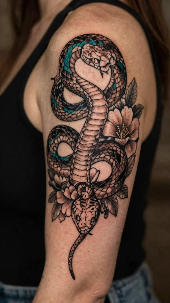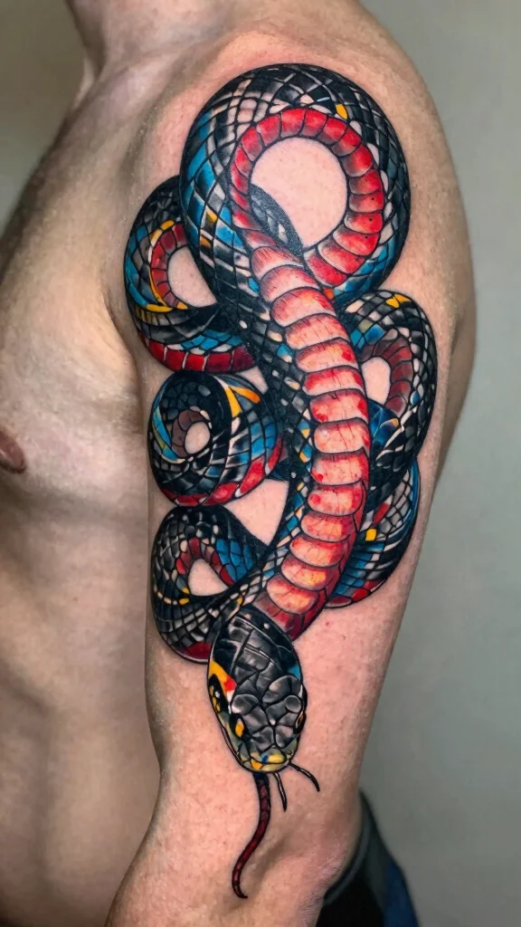 Combining a striking black snake with bright colors creates a bold contrast that is visually stunning. This design allows the intricate shape of the snake to stand out while highlighting its features with vibrant colors. This style symbolizes strength and creativity, making it perfect for those who wish to express their dynamic personalities.