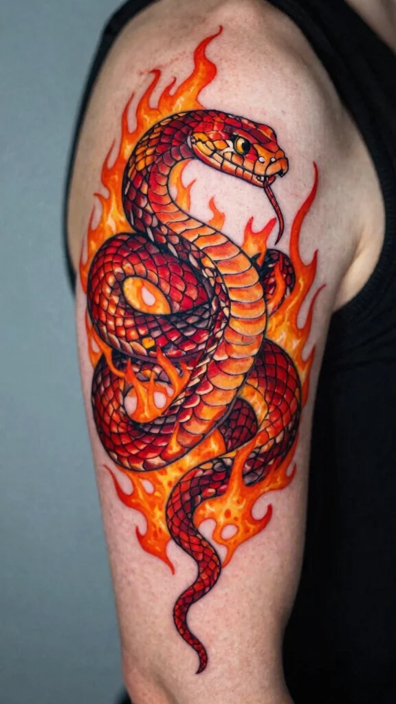 Red and orange tattoo colors are your spark—they turn a simple line into living fire. Embrace gradients and flame-like patterns to make the snake tattoo color feel dynamic and unforgettable, especially when you want bold, vibrant personal expression.