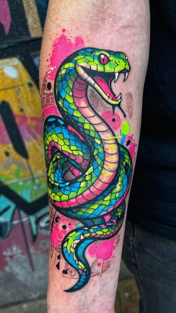 If you thrive in the city, a graffiti-style snake tattoo captures your urban spirit perfectly. Bold colors and street art influences create a unique aesthetic that symbolizes creativity and rebellion. Splashes of neon pinks, greens, and blues can bring this design to life, making it eye-catching and vibrant.