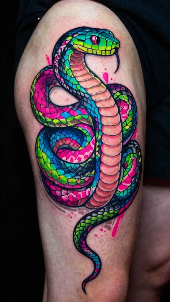 If you love to stand out, an electric neon snake tattoo is the perfect expression of your vibrant personality. Bright pinks, greens, blues, and yellows create an electrifying display that captures attention wherever you go. This style reflects the energy of nightlife and celebration, ideal for someone who loves to live life to the fullest.