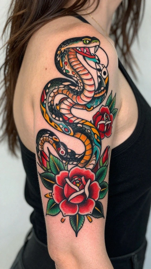 Traditional American snake tattoos bring a nostalgic vibe to modern tattoo culture. These designs feature bold outlines and vibrant colors, often depicting snakes in coiled positions with elements like roses or daggers surrounding them. This style symbolizes both danger and beauty, representing life’s struggles and triumphs. Women who choose this tattoo appreciate a classic look that tells a story and stands out.