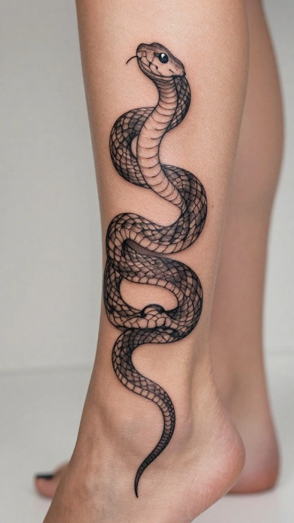 An ankle wrap snake tattoo offers a subtle yet captivating design, symbolizing elegance and strength. This tattoo can range from minimalistic, with the snake coiling around your ankle, to more detailed designs with embellishments. It embodies protection and grounding, making it an intimate choice for women wanting a personal piece of art. This tattoo can be easily concealed or revealed, adding to its charm.
