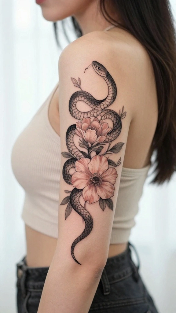 – Combines the fierce symbolism of a snake with the softness of flowers, creating a balanced look.