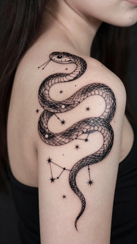For a uniquely creative design, consider a constellation snake tattoo. This artwork combines the imagery of a snake with celestial elements, showcasing stars and constellations within the body of the snake. This design captures dreams and aspirations, merging earthly elements with the cosmic. It’s perfect for women who are dreamers, emphasizing that their inner strength is connected to the universe.